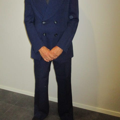 80-luvun kotimainen Kaleva-merkkinen puku 3-os. Ei kokomerkintää mutta tarkista mitat. Veikkaan että vastaa koko B48, tai XS-S.