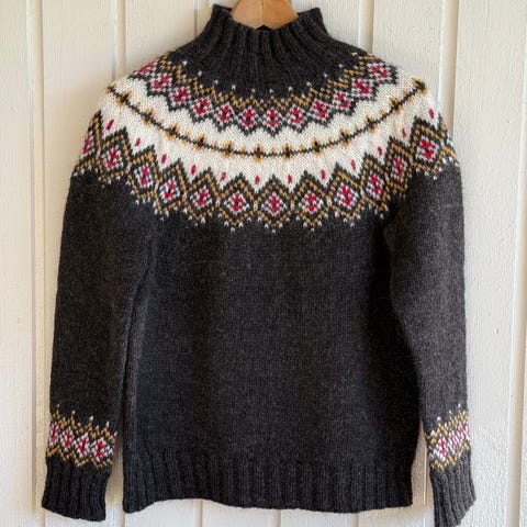 Itse tehty islantilainen villaneule. Kaarrokkeen langat islantilainen Lettlopi ja loppuosa Novitan Nordic Wool Flow ( liukuväri ). Mukaan tulee samoista langoista tehdyt asusteet: Kaulaliina, panta, sukat ( koko 39-40 ) ja lapaset. Kainalo - kainalo 54cm. Olka - helma 62cm. Kainalo - hihansuu 48cm.