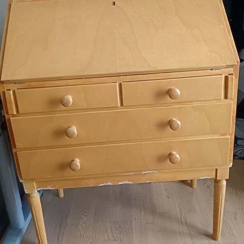 Kirjoituslipasto, jossa on kaksi vetolaatikkoa ja avattava kirjoitustaso. Lipastossa on koristeelliset jalat ja kauniit yksityiskohdat.