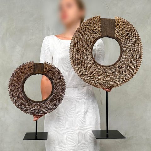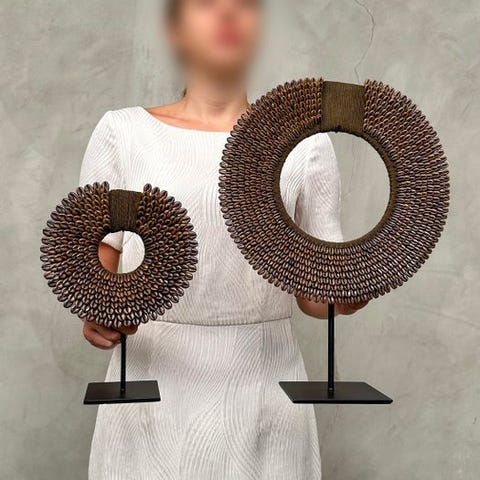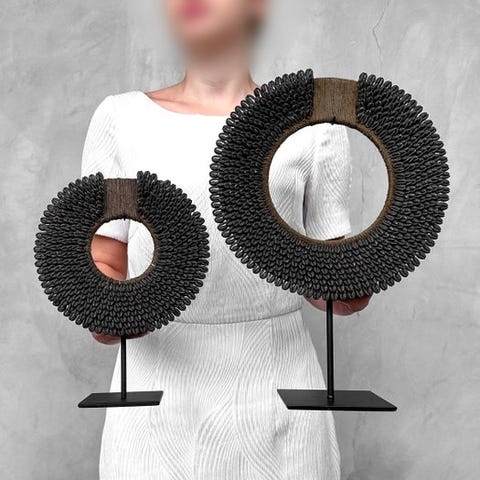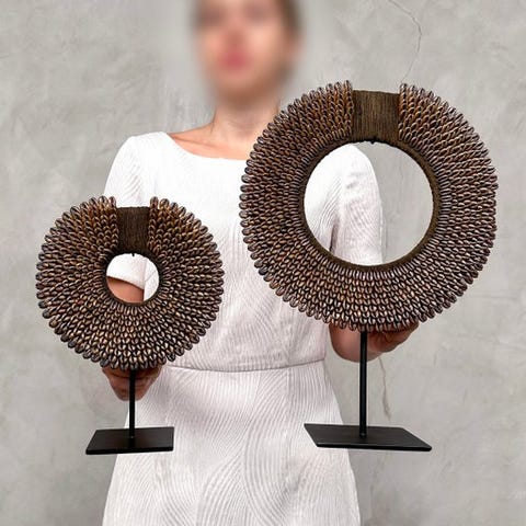Heimojen kaulakoruja, jotka on valmistettu nassa-kalvoista. TOLAÏ-heimo, Uusi Britannia, Papua-Uusi-Guinea. Kaulakorut sisältävät satoja pieniä nassa-kalvoja. Merkittävää on, että lähes kaikki ovat saman kokoisia, minkä vuoksi niissä on erittäin sileä primitiivinen muotoilu.Arviolta mitat, mukaan lukien jalustat.Kaulakoru 1: Korkeus 42 cm, leveys 30 cm.Kaulakoru 2: Korkeus 28 cm, leveys 21 cmPaino, joka mainitaan, sisältää pakkausmateriaalin.LähetysKohde lähetetään seurantanumerolla DHL Parcelin, DPD:n tai postNlin kautta. Seuranta päivittyy Catawiki-luettelossasi, kun pakettisi on jätetty postiin.Ole hyvä ja tarkista säännöllisesti välttääksesi pakettisi palautumisen meille, jolloin ostaja vastaa toisen lähetyksen toimituskuluista.Seurantaan Espanjaan ja Portugaliin käytä tätä linkkiä ja lisää Catawiki-erästäsi saatu seurantanumero.https://clientesparcel.dhl.es/LiveTracking/HomeEMME YHDISTÄ TOIMITUKSIA!!!- Jos sinulla on kysyttävää paketistasi, ota yhteyttä meihin Catawiki-viestipalvelun kautta. Yritämme vastata kolmen työpäivän kuluessa.