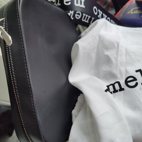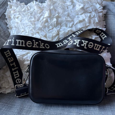 Marimekko nahkainen laukku naisille. Laukku on mustan värinen ja valmistettu nahasta. Siinä on säädettävä olkahihna, jossa on Marimekko-logo. Laukussa on vetoketjukiinnitys ja metalliosat.