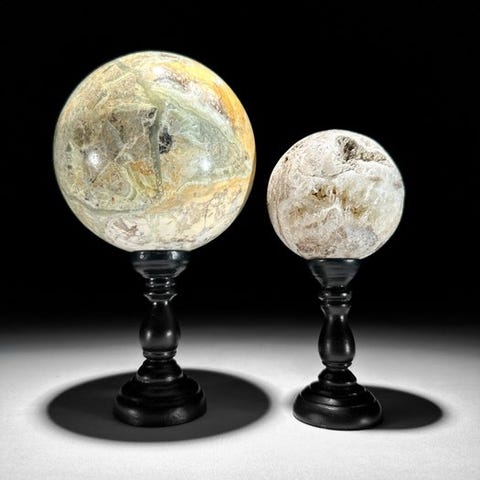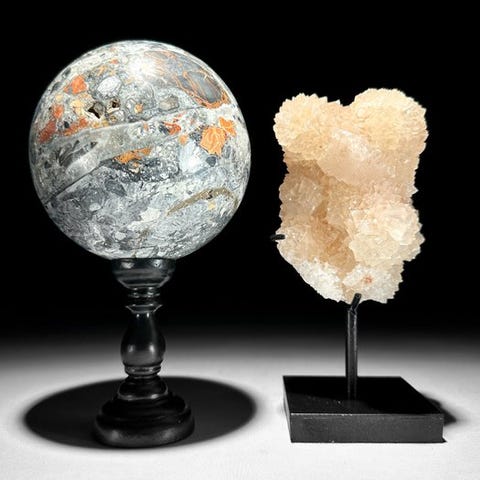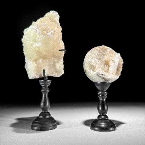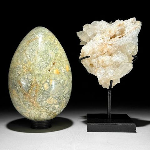 Upea onyx-munamuotoinen ja kuutiomaisen kalkki-kristallikimpun pari, asetettuna räätälöityyn jalustaan.Onyx on tyyppi karneolia, joka on itsessään mikrokrystalline-quartzin muoto. Onyxit muodostavat suoria, lähes rinnakkaisia väriraitoja tai kerroksia, mikä mahdollistaa taitavien jalokiviveistäjien poistaa materiaalia luodakseen cameoja ja intagliosita, joissa on poikkeuksellisen syvä kontrasti.Onyxilla on tyypillisesti musta pohja, johon liittyy valkoisia tai värillisiä raitoja. Värilliset raidat voivat vaihdella ruskean, punaisen, oranssin, keltaisen, vihreän, sinisen ja violetin sävyihin.Kalsiittikuutio viittaa luonnostaan muodostuneeseen tai keinotekoisesti muotoiltuun kalsiittikiteeseen, joka esittää kuutiomuotoa. Kalsiitti kiteytyy tyypillisesti trigonaaliseen kiderakenteeseen, muodostaen rhomboedrisiä tai skalenoedrisiä kiteitä. Kuitenkin tietyissä olosuhteissa kalsiitti voi muodostaa kuutiomaisia kiteitä. Nämä kuutiokiteet ovat suhteellisen harvinaisia verrattuna muihin kalsiitin muotoihin. Kalsiittikuutiot ovat tunnusomaisia geometrisestä muodostaan, joka muistuttaa kuutiota, jossa on kuusi neliömäistä pintaa. Kuutioiden reunat ja kulmat ovat usein selkeästi määriteltyjä, mikä luo symmetrisen ja esteettisesti miellyttävän kiteen. Kalsiittikuutioiden muodostumiseen vaikuttavat tekijät kuten lämpötila, paine ja ympäristön kemiallinen koostumus. Kuutioiset kalsiittikiteet löytyvät yleensä alueilta, joilla on riittävästi tilaa kiteen kasvulle ilman muiden mineraalien häiriöitä.Kalkkikuutiot ovat kiehtovia esimerkkejä mineraalien erilaisista kristallimuodoista, jotka esittelevät luonnollista kauneutta ja sisäistä symmetriaa, jotka kuuluvat kiteisiin rakenteisiin.arvioidut mitat mukaan lukien jalusta# Munan muoto --> Korkeus: 16,3 cm, Halkaisija: 9,8 cm# Cluster --> Korkeus: 19 cm, Leveys: 7,5 cm, Pituus: 8 cmVastuuvapautukset:- Ole tietoinen, että nämä kuvat on otettu pimeässä studiosta; värit voivat vaihdella ympäristön mukaan.Paino sisältää pakkausmateriaalin.LähetysKohde lähetetään seurantanumerolla DHL Parcelin, DPD:n tai postNlin kautta. Seuranta päivittyy Catawiki-luettelossasi, kun pakettisi on jätetty postiin.Ole hyvä ja tarkista säännöllisesti välttääksesi pakettisi palautumisen meille, jolloin ostaja vastaa toisen lähetyksen toimituskuluista.Seurantaan Espanjaan ja Portugaliin käytä tätä linkkiä ja lisää Catawiki-erästäsi saatu seurantanumero.https://clientesparcel.dhl.es/LiveTracking/HomeME EMME YHDISTÄ TOIMITUKSIA!!!Jos sinulla on kysyttävää paketistasi, ota meihin yhteyttä Catawiki-viestipalvelun kautta. Pyrimme vastaamaan kolmessa työpäivässä.