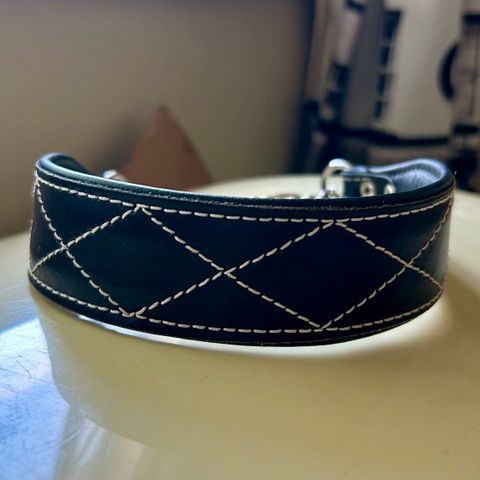 Kaksi puolikuristavaa kaulapantaa. Molemmat on kireimmillään n. 38 cm, pannan leveys 6,5 cm. Pannat saa käännettyä toisin päin jolloin eri kuosi. Yhdessä 8 €, erikseen 5€/kpl.