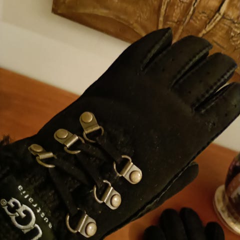 Naisten UGG mustat käsineet pehmeällä mustalla karvavuorella koko 7,5. Ranteessa lukee UGG Australia. Päällysmateriaali on mokkajäljitelmä. Tyylikkäät ja lämpimät. Ollet vähäisessä käytöss, hyväkuntoiset. Nouto tai postimaksu. Myös Toridiili käy.