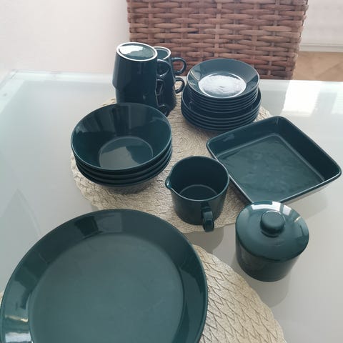 5 kahvikuppia+aluset, 5 pulla-alustaa halk 14cm, 4 kpl murokulhoja, kermakko ja sokerikko, 3 kpl ruokalautasta halk. 23cm, tarjoilukulho 15.5x15.5cm.