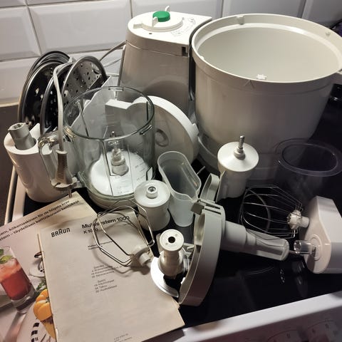 Braun Multiquick 7 K3000 monitoimikone, jossa useita lisäosia. Sisältää kulhon, vispilät ja terät erilaisiin ruoanvalmistustehtäviin. Laite soveltuu monipuoliseen ruoanlaittoon ja leivontaan.Tullut talouteen lahjana,mutta jäänyt käyttämättä.Toimii kyllä.