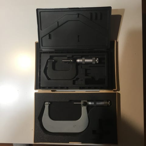 USSR MK-25 mikrometri mittalaite sarja, sisältää useita mittalaitteita ja mittapään, mukana alkuperäinen metallikotelo ja käyttöohjeet. Valmistusvuosi 1967. Käytetty mittausvälineiden sarja tarkkoihin pituusmittauksiin.