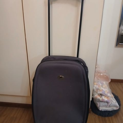 Hyväkuntoinen musta matkalaukku, tämä on lentolaukun kokoinen. Vetoaisa kääntyvät pyörät kunnossa. Materiaali on kova muovi.