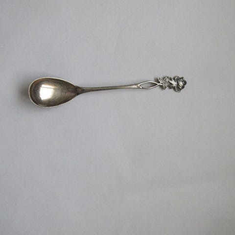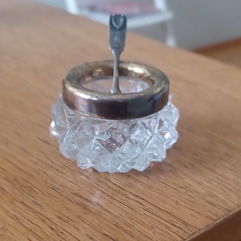 Antiikki suolakuppi ja lusikka hopea ja kristalli