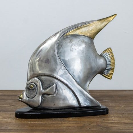 Niille, jotka ovat valmiita rokkaamaan, tämä veistos saattaa olla juuri sitä, mitä tarvitset! Muille se näyttää silti siistiltä!KestävyysMessinkiveistoksemme on valmistettu kierrätetyistä metalleista, kuten vanhoista putkista. Käsityöläisemme keräävät tämän romumateriaalin, jonka he sitten laittavat uuniin erittäin korkeissa lämpötiloissa. Kun romupalat sulavat, uusi raaka-aine on valmis käytettäväksi. Käytämme tätä alkuperäistä materiaalia valmistamaan messinkiveistoksemme. Koska messinki on erittäin ympäristöystävällinen ja työvoimavaltaista louhittavaa materiaalia, uskomme, että on järkevämpää uudelleenkäyttää jo luotua materiaalia kuin louhia sitä uudelleen. Näin pyrimme sulkemaan ainakin yhden jätekierron.Läpinäkyvyys & kuka teki senLopuksi, kun kyse on työolosuhteistamme, teemme yhteistyötä ainoastaan Indonesian käsityöläisten kanssa sekä Balilla että Javalla. Tämä kappale on erityisesti valmistettu Javalla, Indonesiassa. Kaikki käsityöläisemme saavat palkkaa, joka ylittää Indonesian lain vaatimukset. Heidän tulonsa riittävät mukavaan kotiin, ruokaan, koulutukseen, seremonioihin ja muuhun.ToimitusTuote lähetetään seurantanumerolla DHL Parcelin, DPD:n tai postNl:n kautta. Seuranta päivittyy Catawiki-luettelossasi, kun pakettisi on jätetty postiin.Tarkista säännöllisesti välttääksesi pakettisi palauttamisen meille, jolloin ostaja vastaa toisen lähetyksen toimituskuluista.- Seurantaan Espanjaan ja Portugaliin käytä tätä linkkiä ja lisää Catawiki-eräsi seurantanumero.https://clientesparcel.dhl.es/LiveTracking/HomeME EMME YHDISTÄ TOIMITUKSIA!!!Jos sinulla on kysyttävää paketistasi, ota meihin yhteyttä Catawiki-viestipalvelun kautta. Pyrimme vastaamaan kolmessa työpäivässä.HUOM.Patsaimme valmistetaan käsin, ja koska se on luonnontuote, väri saattaa vaihdella kuvan kanssa.Ole hyvä ja sallithan 1-2 cm:n mittauseron.