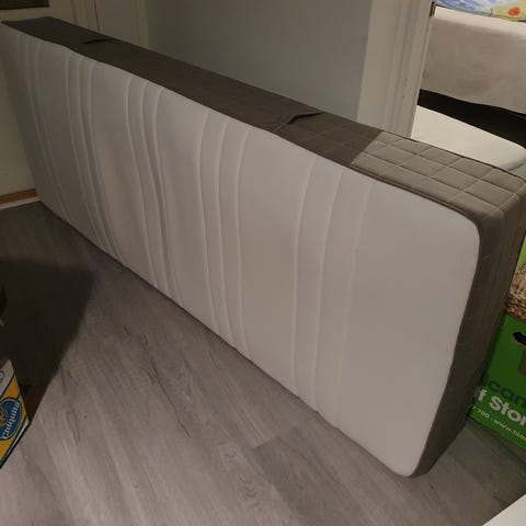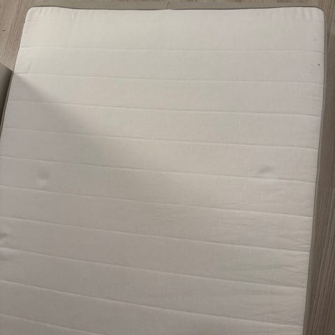IKEA Hövåg sänky, jossa valkoinen patjan pinta ja harmaa/sininen reunus. Kiinteähkö patja ja vieläkin hyvässä kunnossa. Ei näytä olevan mitään tahroja.