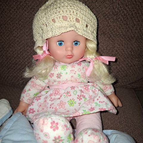 Vauvan koko 33cm. Mukana peitto, tyyny, patja ja pieni tarvikepussi jossa hoitovälineitä.