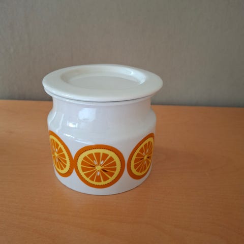 Arabia Pomona appelsiinikuvioinen purkki kannella. Erittäin hyvässä kunnossa, pohjassa pientä kulumaa, korkeus 9cm ja halkaisija noin 10cm. Halutessaan mukaan tulee myös pienempi purkki joka näkyy yhdessä kuvassa, siinä halkeama.