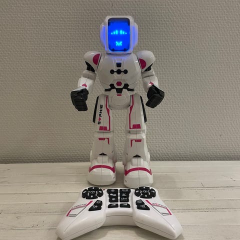 Kauko-ohjaimella tai käden liikkeillä ohjattava robotti.