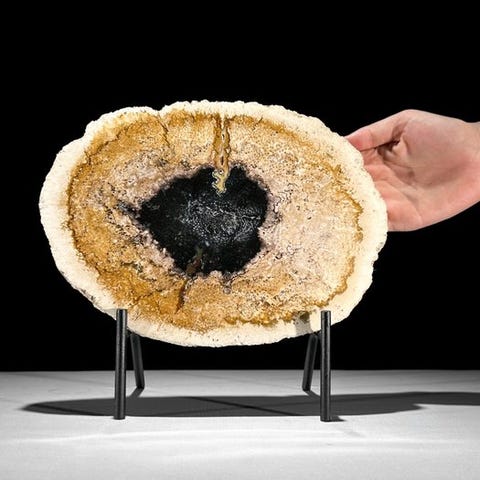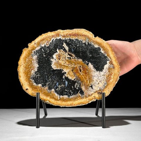 Upea pala muinaistunutta palmupuun juurta räätälöidyllä jalustalla.Kaunis viipale fossiilista palmupuun runkoa, jossa on upeita värisävyjä ja tyypillinen puhkeama. Kuoren näkyvyys on selkeä ulkopuolella, ja palmupuun tyypillinen muodostuma erottuu keskellä. Osan sisäosasta on geodeettisesti kiteytynyt. Viipale on erittäin kauniisti kiillotettu, mikä tekee yksityiskohdat selvästi näkyviksi.Noin mitat - mukaan lukien jalustaKorkeus: 28,5 cm - Leveys: 30 cm, Viipaleen paksuus: 1,8 cmNoin mitat - ilman jalustaa.Korkeus: 23 cm – Leveys: 30 cm, Viipaleen paksuus: 1,8 cmVastuuvapautukset:- Olkaa tietoisia siitä, että yksi tuotteista on otettu pimeässä studiossa; värit voivat vaihdella ympäristön mukaan.Paino sisältää pakkausmateriaalin.LähetysKohde lähetetään seurantanumerolla DHL Parcelin, DPD:n tai postNlin kautta. Seuranta päivittyy Catawiki-luettelossasi, kun pakettisi on jätetty postiin.Ole hyvä ja tarkista säännöllisesti välttääksesi pakettisi palautumisen meille, jolloin ostaja vastaa toisen lähetyksen toimituskuluista.Seurantaan Espanjaan ja Portugaliin käytä tätä linkkiä ja lisää Catawiki-erästäsi saatu seurantanumero.https://clientesparcel.dhl.es/LiveTracking/HomeEMME YHDISTÄ TOIMITUKSIA!!!- Jos sinulla on kysyttävää paketistasi, ota yhteyttä meihin Catawiki-viestipalvelun kautta. Yritämme vastata kolmen työpäivän kuluessa.