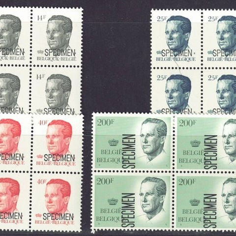 10 lohkoa, joissa jokaisessa 4 kappaletta, leimat tyyppiä Elstrom ja painatus "specimen", joita käytettiin postikoulussa postivirkailijoiden koulutukseen — harvoin tarjolla.