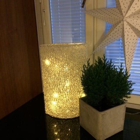 Kynttiläkruunuun kieputettu valosarja. Valaisee oikein kauniisti. Kynttilät enemmän koristeena. Levein halkaisija 65 cm, korkeus kahdella koukulla 115 cm.