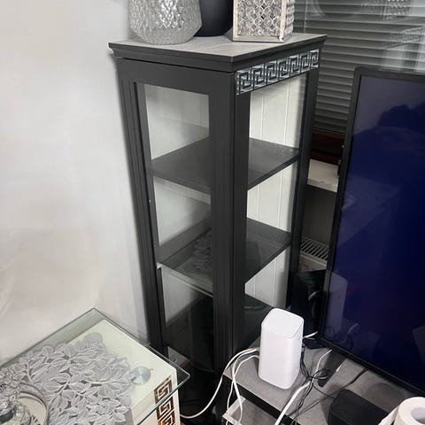 vitriinikaappi, joka on valmistettu puusta ja lasista. Kaapissa lasiovet ja kaksi sisähyllyä. Soveltuu esineiden ja koristeiden säilytykseen.