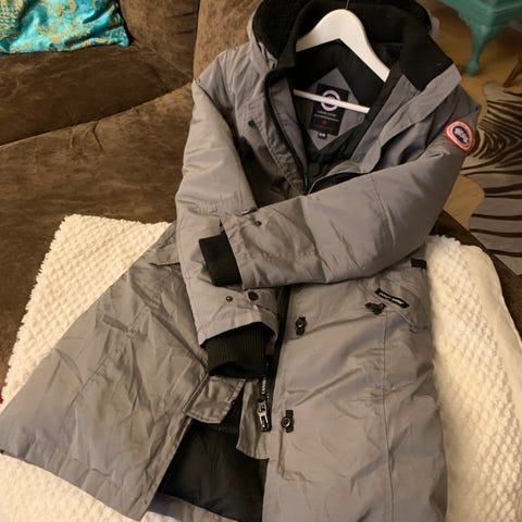 Tummanharmaa untuvatakki, jota on käytetty ulkoilussa noin 20 kertaa.