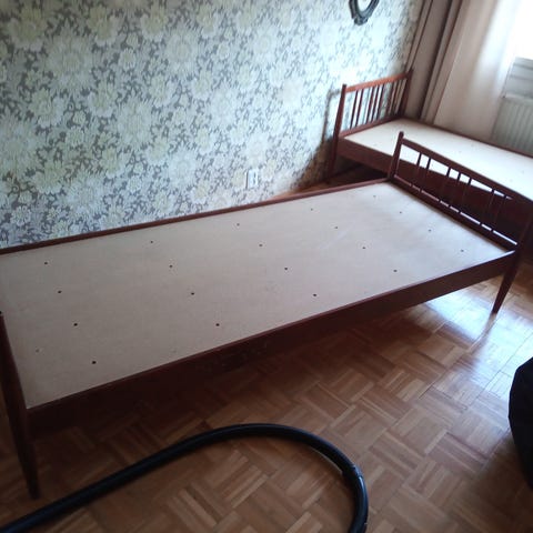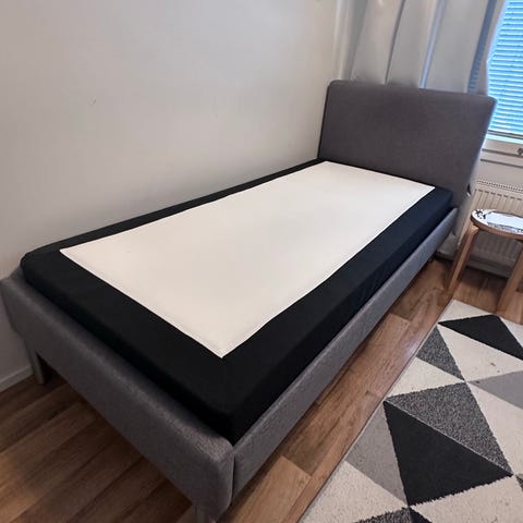 Harmaa Jyskistä ostettu sängyn runko, kaksi joustinpatjaa (Dreamzone) ja petauspatja (Ikea Tussöy). Joustinpatjat 90x200cm ja petauspatja 180 cm. Joustinpatjoissa kova ja keskikova -puoli. Runko ostettu 2017 ja patjat 9/2019. Kaikissa patjoissa irroitettavat patjanpäälliset. Petauspatjan päällinen pesty ennen myyntiä.