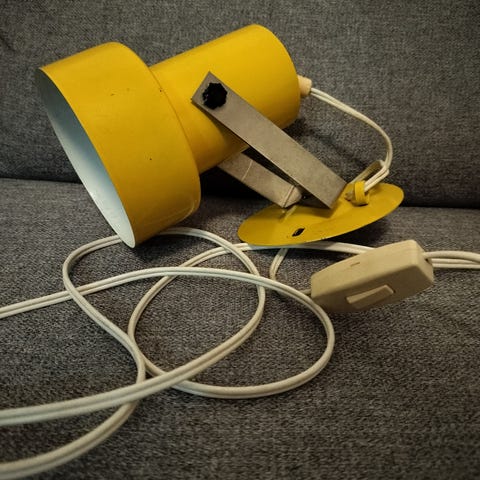 • Kunto: Erinomainen vintage-kunto. Maalipinta on säilynyt hienosti ja nivel on jämäkkä – varjostimen saa suunnattua juuri haluttuun kulmaan.