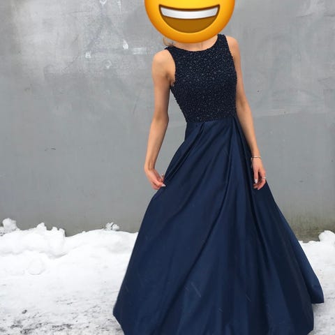 Pitkä vaaleanpunainen tai vanhan roosan värinen iltapuku, vanhojentanssimekko. Vartalonmyötäinen, joustava, hyvin laskeutuva. Trumpet-, merenneitotyylinen helma, edessä runsaasti strasseja. Kiinteät rintakupit ja alushame. Koko S. Voi sovittaa Espoon Nöykkiössä. Kerran tanssittu.