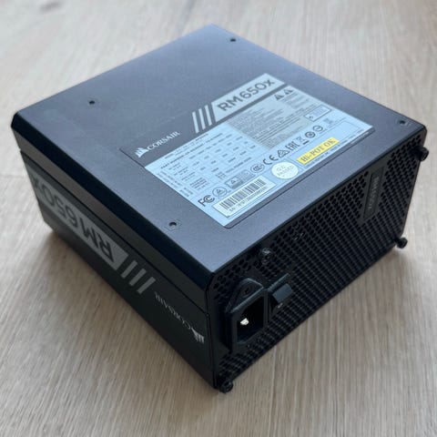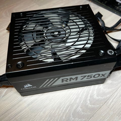 Corsair RM1000e V2 virtalähde. Tilasin tämän -23 lopulla ihan omaan koneeseen alunperin, oli muutaman viikon kiinni mutta en oikein pitänyt tuulettimen laakerin pitämästä äänestä, joten hommasin eri valmistajan virtalähteen tilalle. Tämä on siitä lähtien lojunut kaapissa käyttämättömänä eli on kuin uusi, täysin pölytön yksilö. Tuotepakkaus sekä kaikki alkuperäset virtakaapelit tulee mukaan.