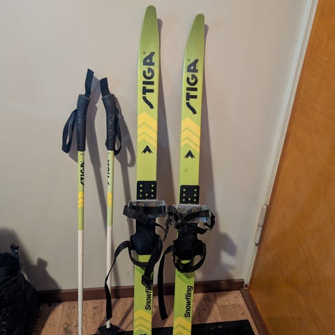 Stiga snowfling sukset ja sauvat. Sukset 90cm, sauvat 70 cm. Hyvät ensisukset. Kiinnitys hihnoilla eli monoja ei tarvita. Säädettävät siteet.