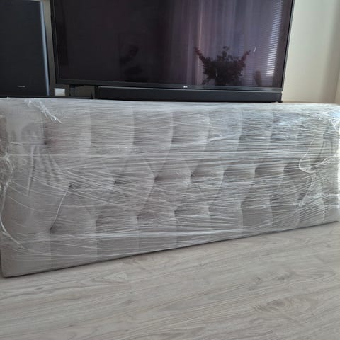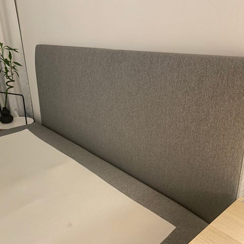 Ellos sängynpääty, vaalean sävyinen ja pehmeä materiaali. Kangas hieman värjäytynyt, eli vaatii pesun. Muuten täysin moitteettomassa kunnossa.
