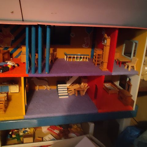 Hieno nukketalo. Jotakin käytön jälkeä löytyy, mutta ehjä. Mukaan saa huonekalut.