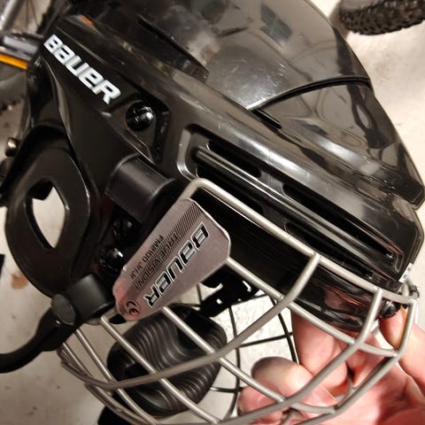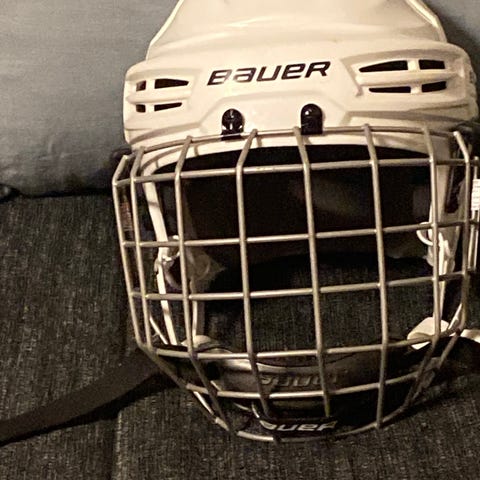 Bauer jääkiekkokypärä valkoisena. Kypärä on suunniteltu jääkiekkokäyttöön ja siinä on metallinen kasvonsuoja. Varustettu säädettävillä remmeillä ja pehmusteilla sisäpuolella istuvuuden parantamiseksi.