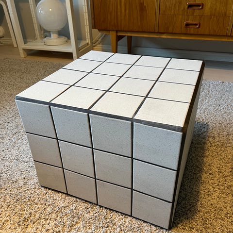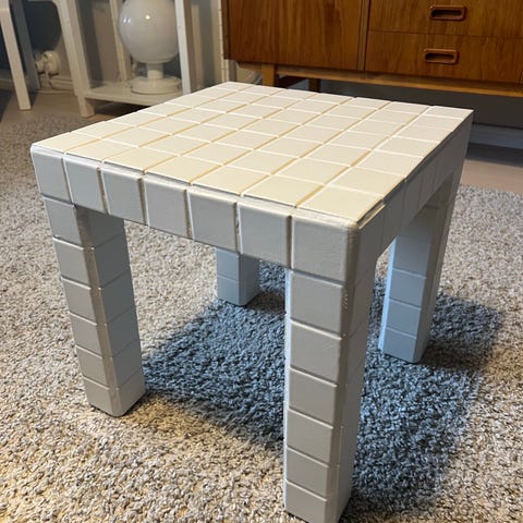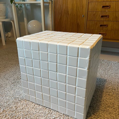 Valkoinen kaakelipöytä. Toimii esim. kahvipöytänä tai kukkaruukun alla. Jotkut saumat värjäytyneet pinkiksi, mutta muuten hyvässä kunnossa.