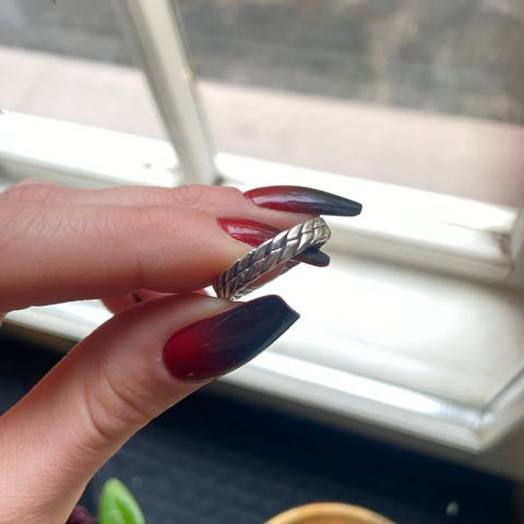Sormus 925 hopeaa vaaleanpunaisella laattamaisella kivellä. Koko 19, leveys enimmillään 15 mm ja pienimmillään 7 mm.