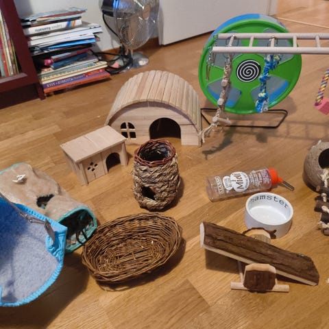 Tästä kaikki tarvittava jyrsijälle. Sisältää häkin, L72 S46 ja K 32, kaikki kuvassa näkyvät tarvikkeet, aitauksen, kuljetuskopan sekä puruja.