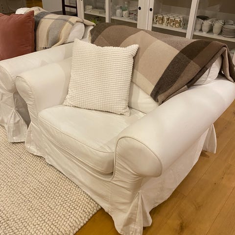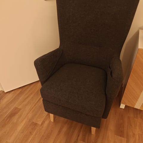 Nojatuolidivaani, Ikean malli, ei enää myynnissä. Irtopäällinen, jossa muutamia tahroja. Päällisen voi pestä. Divaaniosassa kätevä säilytystila.