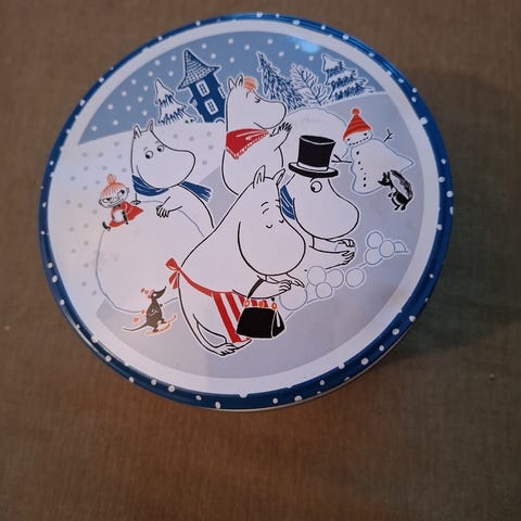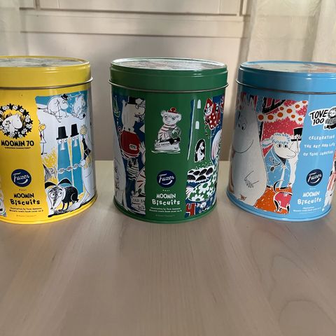 Kuusi peltistä Muumi-säilytyspurkkia, valmistaja Martinex. Käytössä tullut pieniä naarmuja, ja osassa säilytetty esim sokeria. Tarkempi puhdistus jääköön ostajalle.
