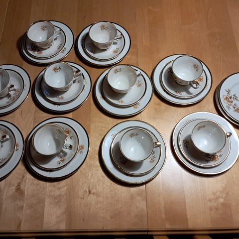 Kaikki ovat ehjiä, osassa lautasia on kultauksessa kulumaa.