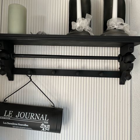 Hyväkuntoinen musta kapea hylly, yläosan saa seinään kiinni. Vain nouto