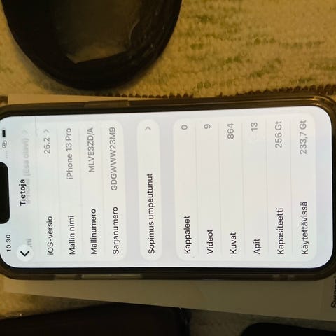 Apple iPhone 13 Pro max 128 GB. Takalasi rikki, ei haittaa käyttöä suojakuorien alla. Muutenkin ulkoisesti elämää nähnyt ja naarmuja kerännyt. Jos ulkoiset tekijät ei haittaa niin tästä edullisesti iphone suoraan käyttöön. Mukaan tulee alkuperäinen pakkaus, latauskaapeli ja suojakuoret. Näytönpäällä on suojalasi. Akun kapasiteetti 87%