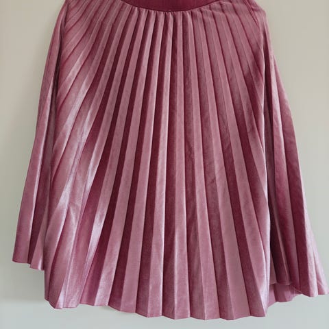 Ulkomailta tuotu vaaleanpunainen hame, koko 10 (vastannee 134/140). Vyötärön leveys 29cm, pituus 36,5cm. Paikoitellen pientä haituvaa, yhdessä kohdassa vähän enemmän pörröä (jäänyt ehkä johonkin tarranauhaan kiinni), merkkilappu vyötäröstä katkennut. Yleisilmeeltään siisti. Savuton ja karvaton koti, hajusteeton pesu.