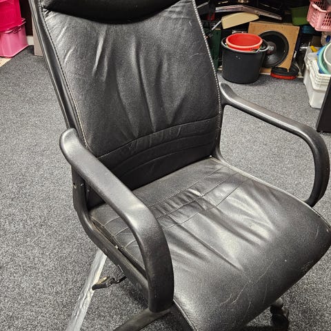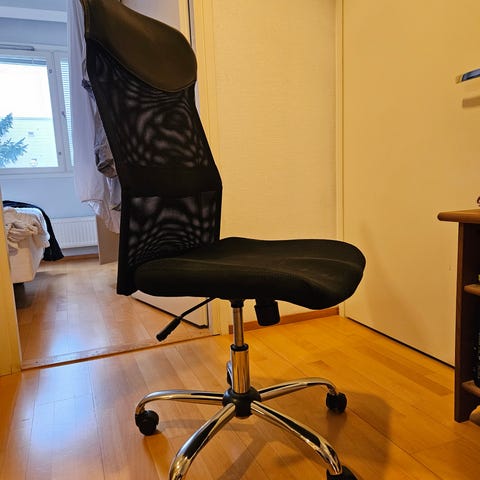 OK kuntoinen toimistotuoli, hiukan antaa myöden oikealle istuessa. Muuten toimiva ja käyttökelpoinen.