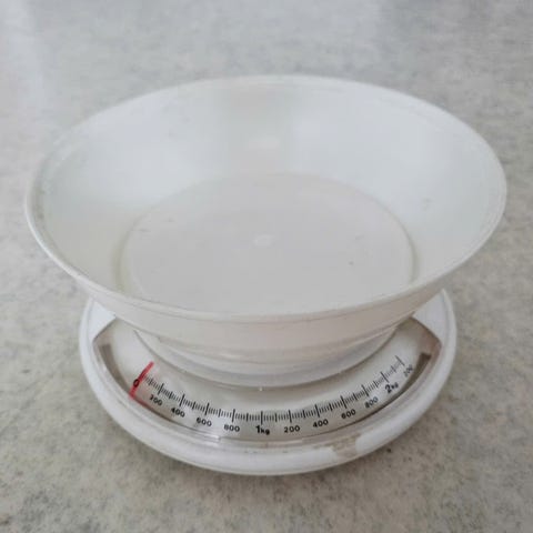 Lähes käyttämätön keittiövaaka kulholla.