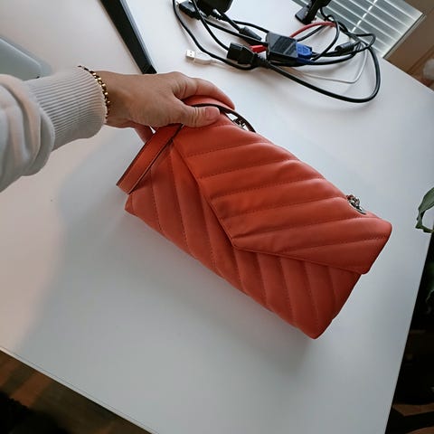 Naisten käsilaukku vaaleanpunainen, jossa on koristeellinen rusetti. Mitat n. 13 cm ja 21,5 cm.