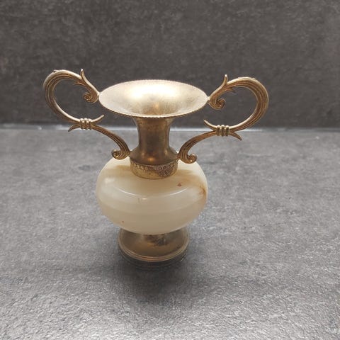 Kynäteline arviolta 1920-1930-luvulta. Jalusta marmoria 90 x 90 mm, paksuus 18 mm. Kokonaiskorkeus 105 mm. Kynän pidike pyörii hyvin jalustassaan.