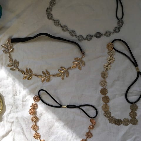Hiuspantoja, kahdenlaisia pinnejä, normi ja hengettömiä, hiussolki, nutturalasso, hiustyyny, samettinen hiuspanta ja nutturadonitsi, josta pinnien vuoksi "rispaantunut" muutama lanka, mutta on siis erittäin käyttökuntoinen ja siisti edelleen.