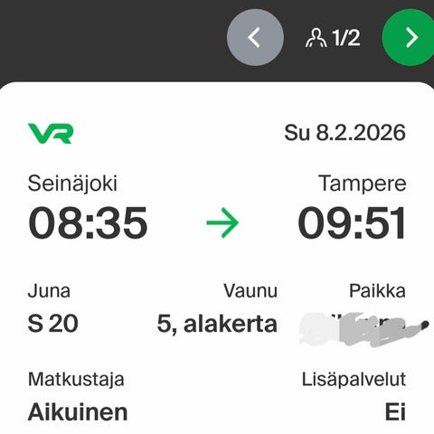 2 lippua la 7.2. Klo 17:18 Seinäjoelta Tampereelle lähtevään junaan. Vierekkäiset paikat.