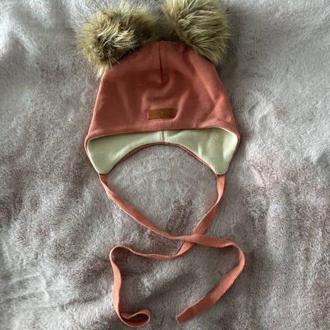 Ihana persikan värinen pipo kahdella tupsulla. Muuten hyväkuntoinen, toisessa narussa pieni moite, joka näkyy kuvassa. Koko L
