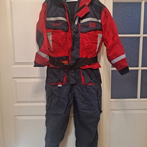 Vihreä talvipuku, jossa on huppu ja useita taskuja. Puvun materiaali on tarkoitettu suojaamaan kylmältä säältä. Sopii ulkoiluun ja työskentelyyn kylmissä olosuhteissa.
