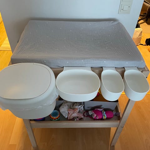 IKEA Gulliver lastenhoitopöytä. Kaksi hyllytasoa säilytystilaa varten. Kunto erinomainen. En löydä moitteita. Ostettu uutena 2024. Vuoden ollut käytössä yhdellä lapsella. Ovh 119€. Mukaan Värda hoitoalusta.