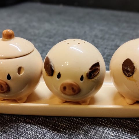 Iittala possu-muotoiset keittiövälineet, suolasirotin ja pippurimylly. Keraamiset esineet, joissa koristeena vihanneksia ja hedelmiä. Sopivat mausteiden annosteluun keittiössä.